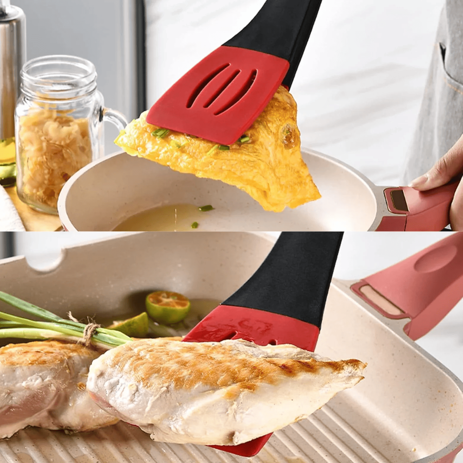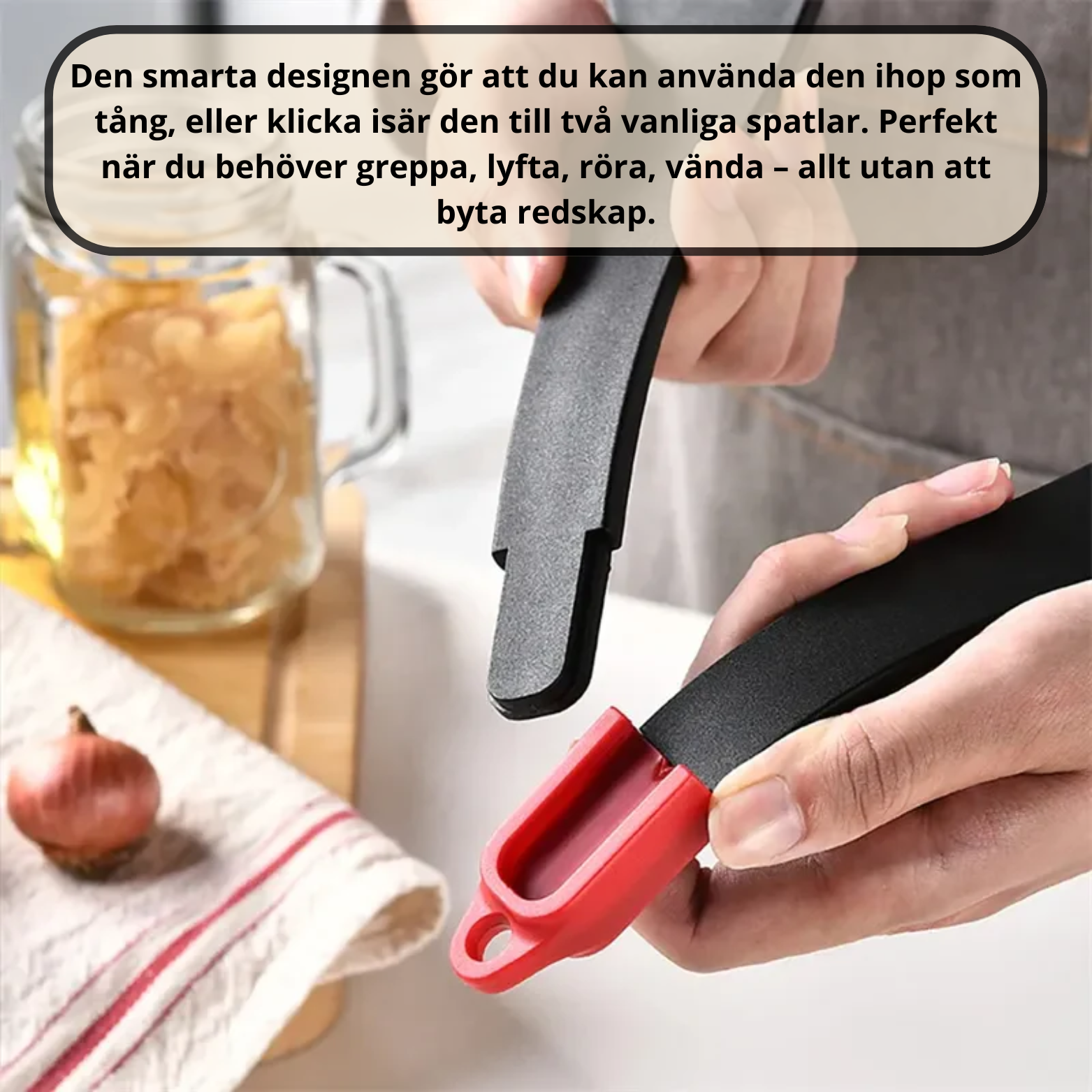 Det här multifunktionella verktyget är tillverkat i värmetåligt silikon, vilket skyddar dina stekpannor och kastruller från repor. Du kan enkelt separera spatlarna och använda dem individuellt eller ihop som en grilltång. Passar utmärkt till stekning, servering, sallader och mer.
