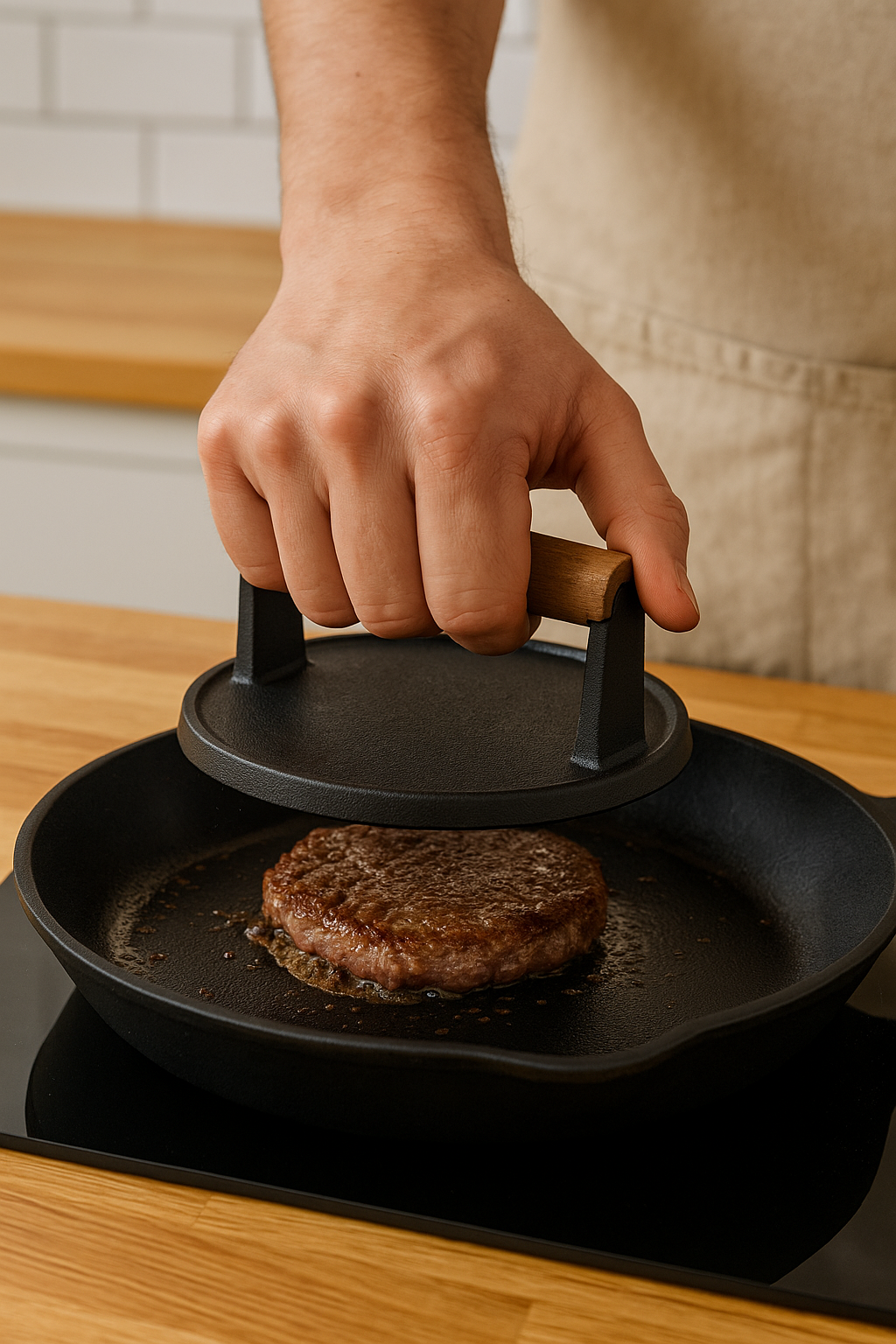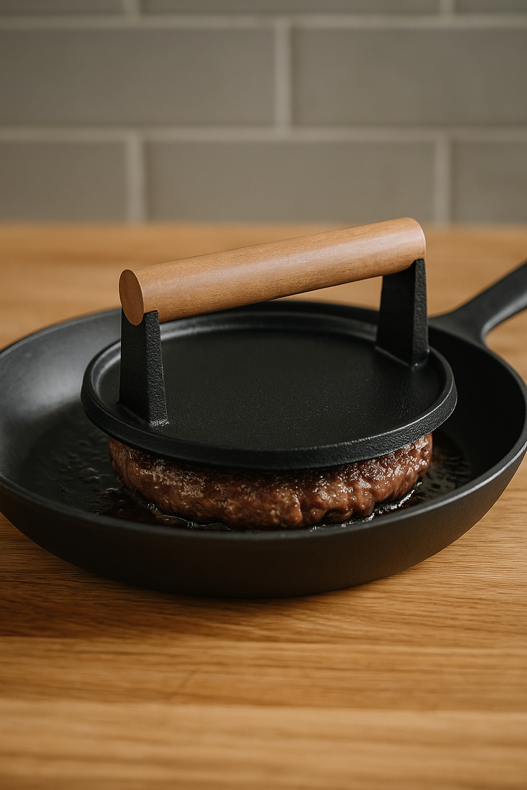 Uppgradera ditt kök med denna robusta köttpress i gjutjärn, utrustad med ett elegant trähandtag för ett bekvämt grepp. Perfekt för att pressa hamburgare, kött och annat på grillen eller stekpannan. Designad för att ge jämn tillagning och ett krispigt resultat. Passar både hemmakockar och grillentusiaster som söker kvalitativa köksredskap i trä. Enkel att rengöra och tålig nog för daglig användning. Ett oumbärligt grillverktyg som kombinerar funktion med stil.