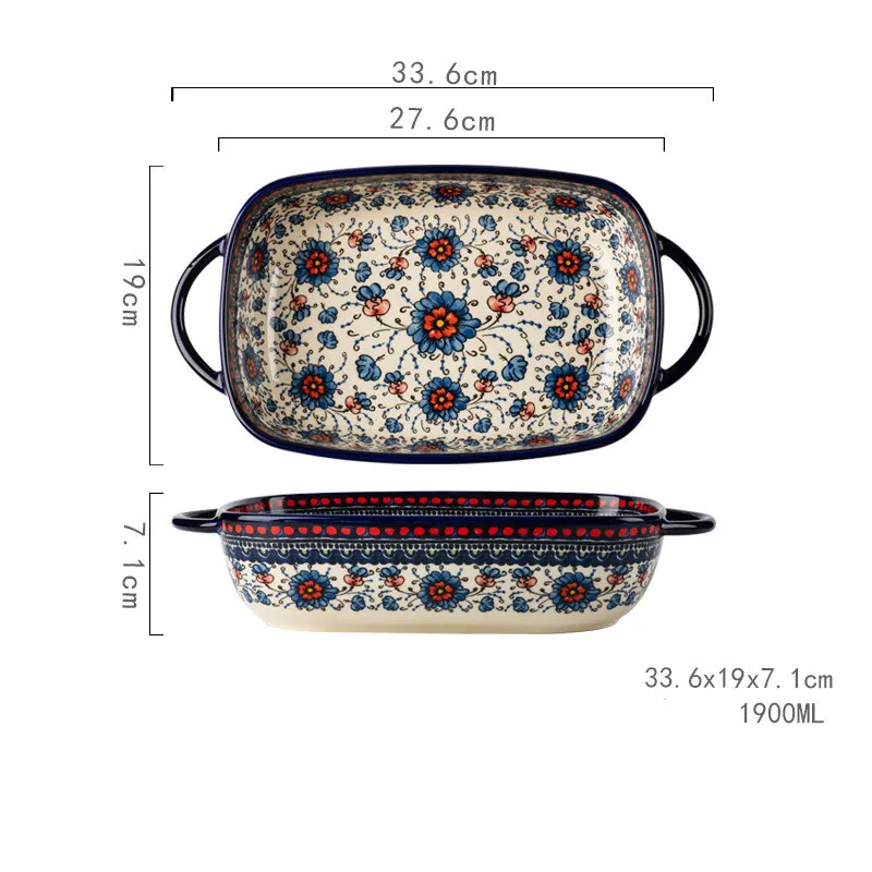 Denna vackert designade serveringsform i keramik är både funktionell och dekorativ. Perfekt för att laga och servera gratänger, lasagne eller varma rätter direkt från ugnen. Med färgglatt handmålat blommönster, två handtag och ugnssäker keramik är detta en form som imponerar både på matbordet och i köket.