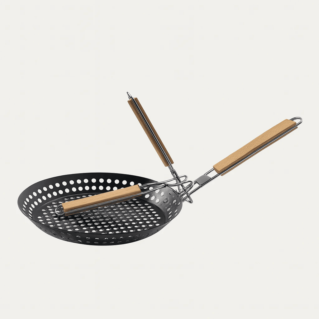 Upptäck vår praktiska grillpanna med hål, perfekt för BBQ-entusiaster. Den robusta designen i kolstål med non-stick-beläggning gör att du enkelt kan grilla grönsaker, kött eller fisk utan att maten faller igenom gallret. Trähandtaget ger ett bekvämt grepp och förblir svalt. Passar gasgrillar, kolgrillar och utekök. En oumbärlig accessoar för grillälskare!