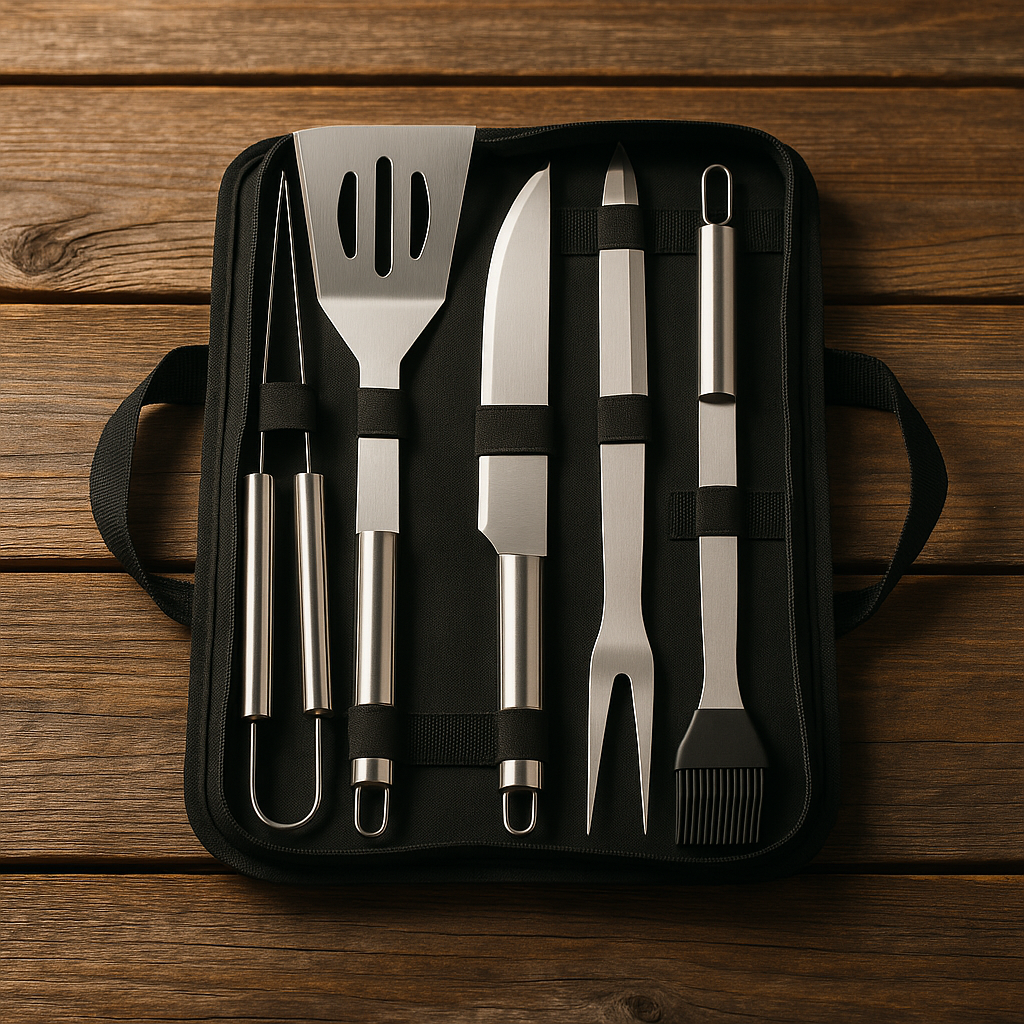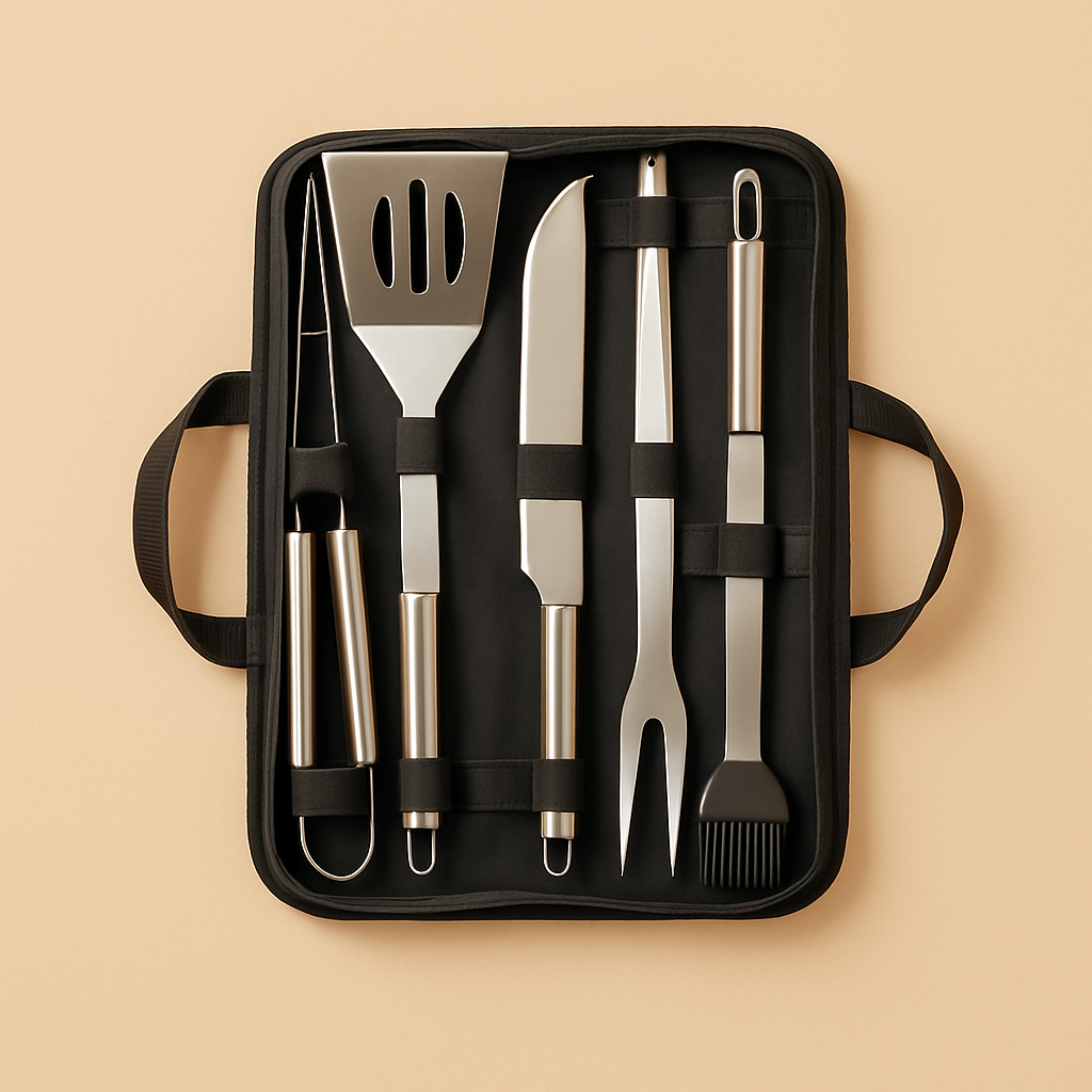 Gör varje grillning till en professionell upplevelse med vårt lyxiga grillverktygsset i 5 delar. Tillverkade i slitstarkt rostfritt stål och förpackade i en elegant aluminiumväska – perfekt för hemmet, sommarstugan eller som present. Setet innehåller tänger, grillspade, pensel, grillgaffel och mycket mer.