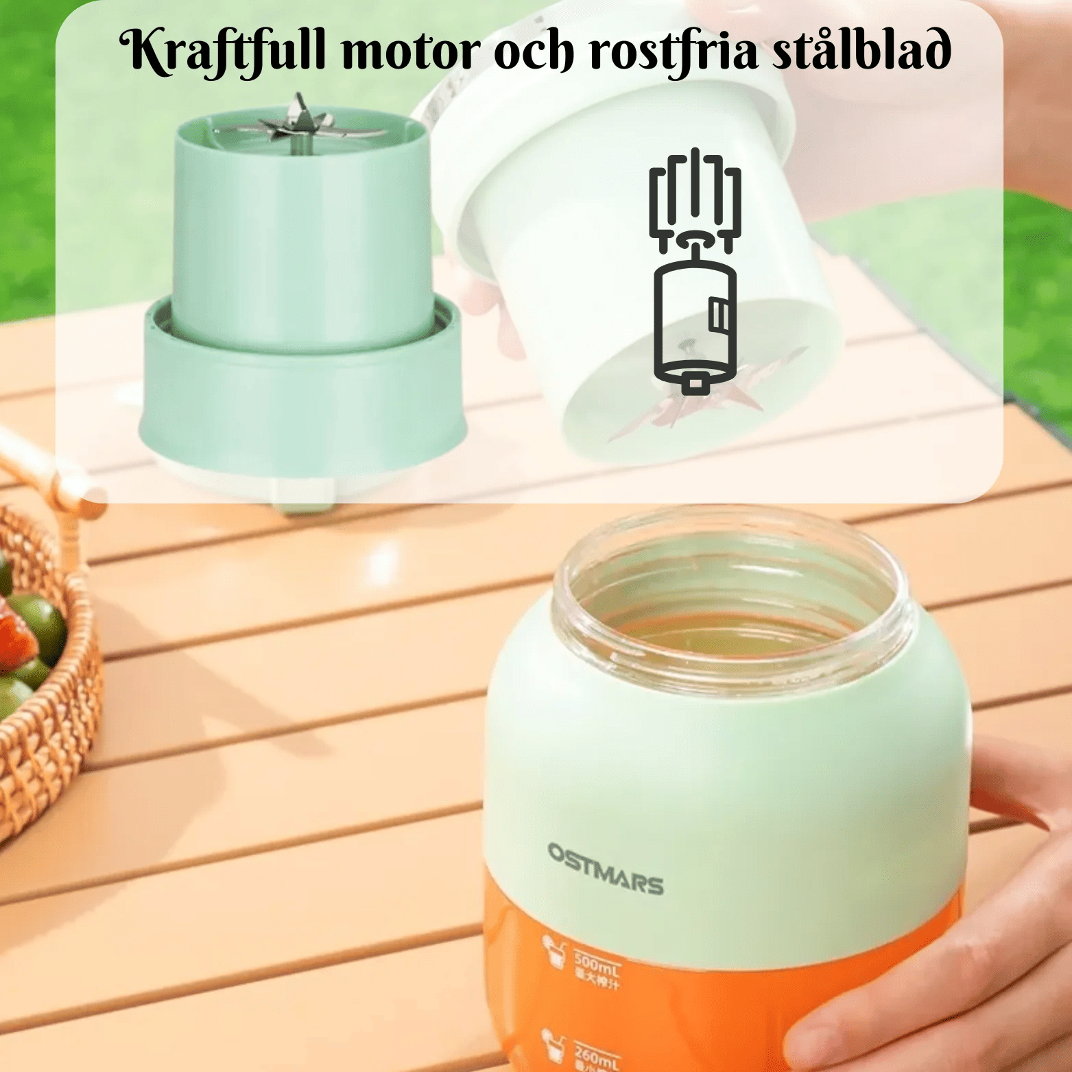 Den är tillverkad av livsmedelssäkra material och har tydlig volymmarkering (260 ml / 500 ml) så att du alltid får rätt mängd. Med USB-laddning och upp till 4 timmars batteritid kan du alltid njuta av hälsosamma drycker – snabbt och enkelt!