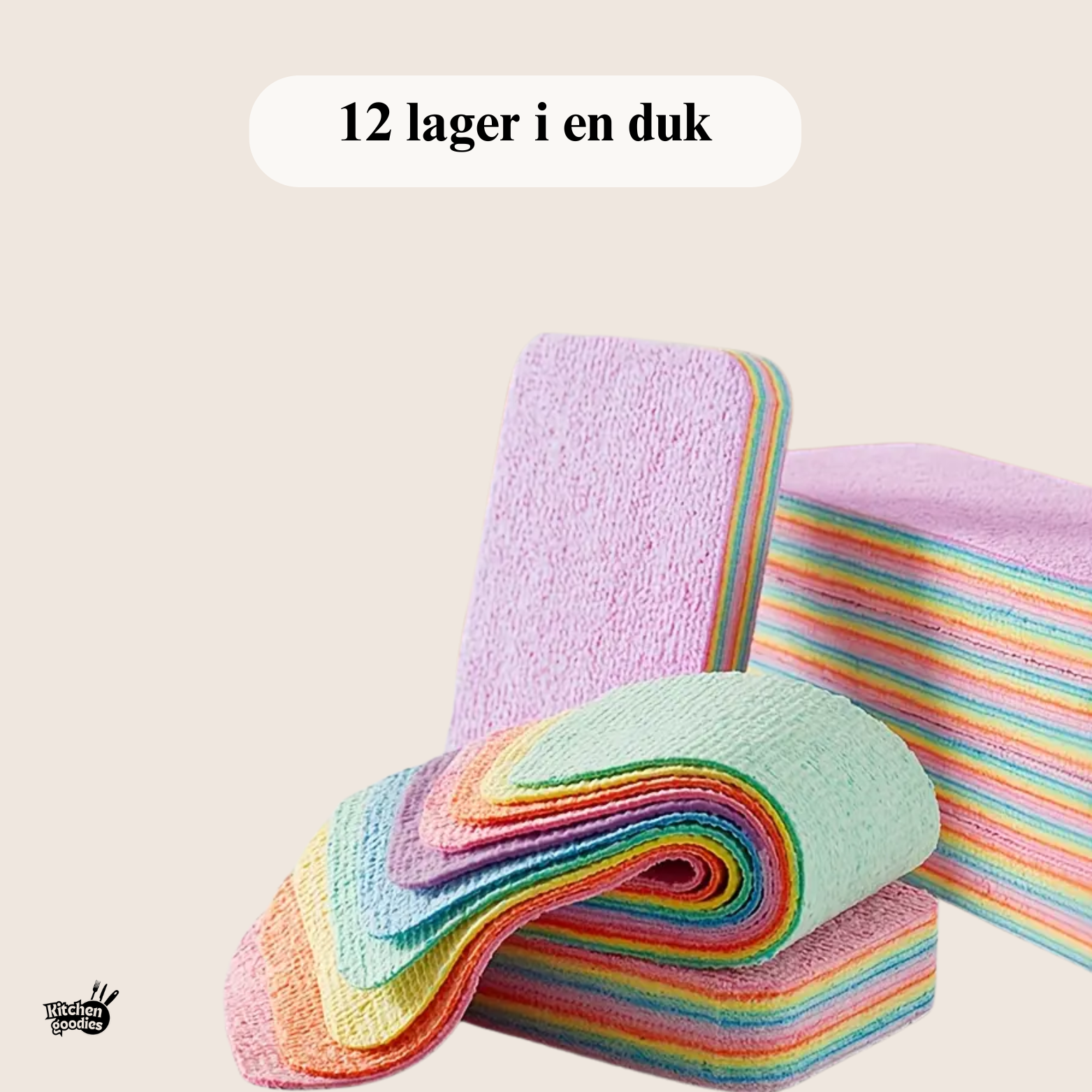 Trött på smutsiga trasor? Vår Rivbara Regnbågsduk är designad med 12 lager så att du enkelt kan riva av ett lager när det blir smutsigt och fortsätta med en fräsch yta. Perfekt för köket, badrummet, bilen eller kontoret.