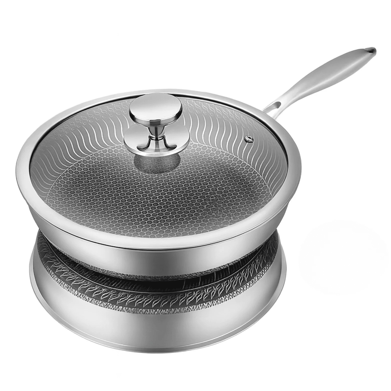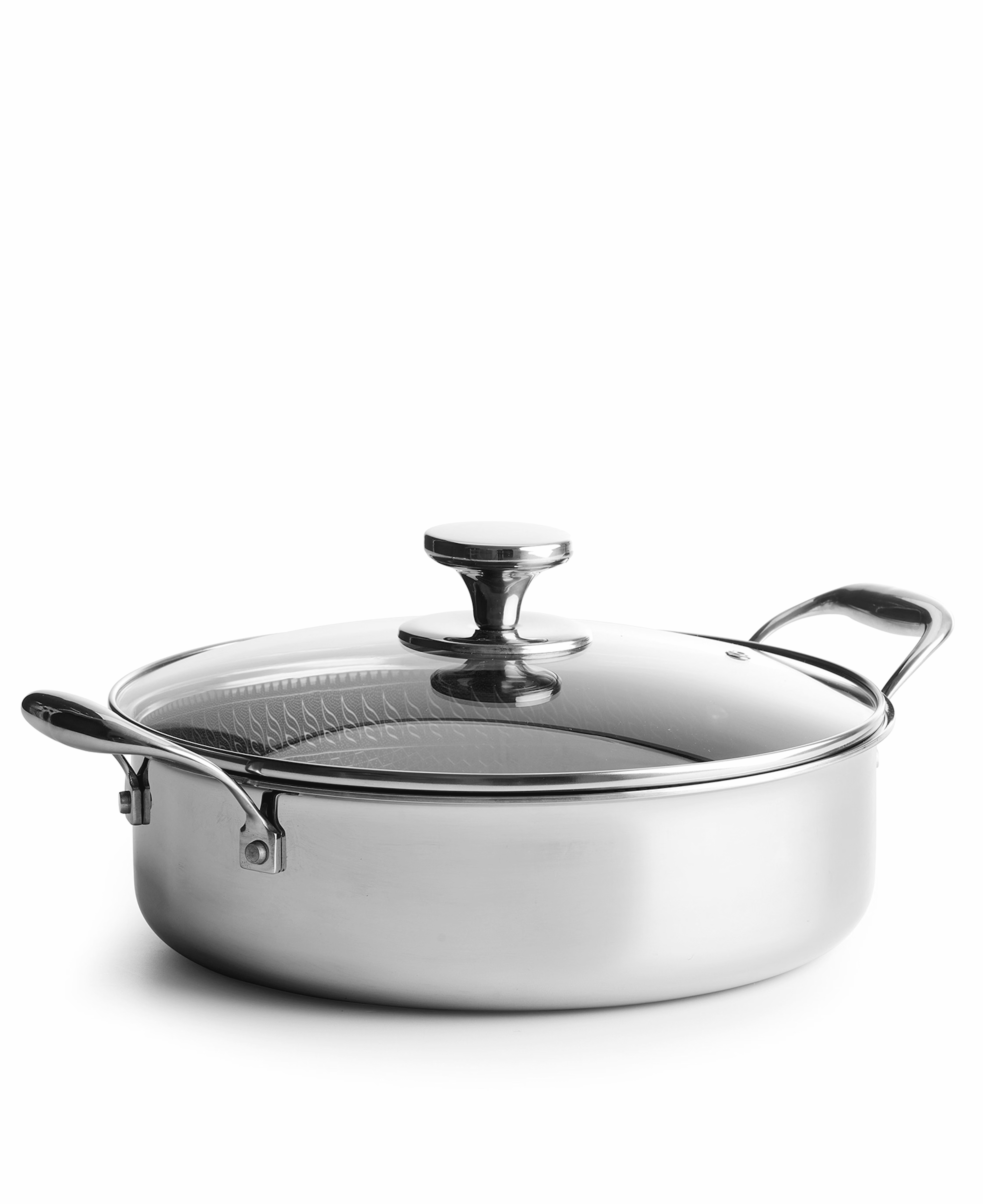 Uppgradera ditt kök med denna exklusiva stek- och gryta i rostfritt stål – känd för sin högre motståndskraft mot korrosion och perfekt för hälsosam matlagning utan beläggning. Pannan har en djupdesign (6,3 cm) med kompositbotten i flera lager som ger snabb och jämn värmefördelning.