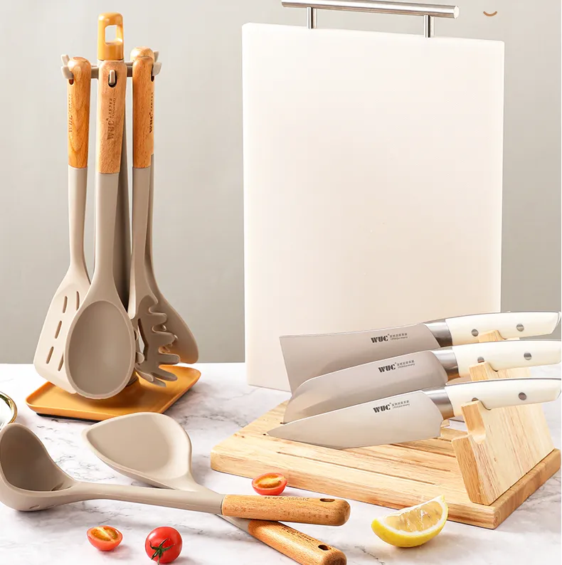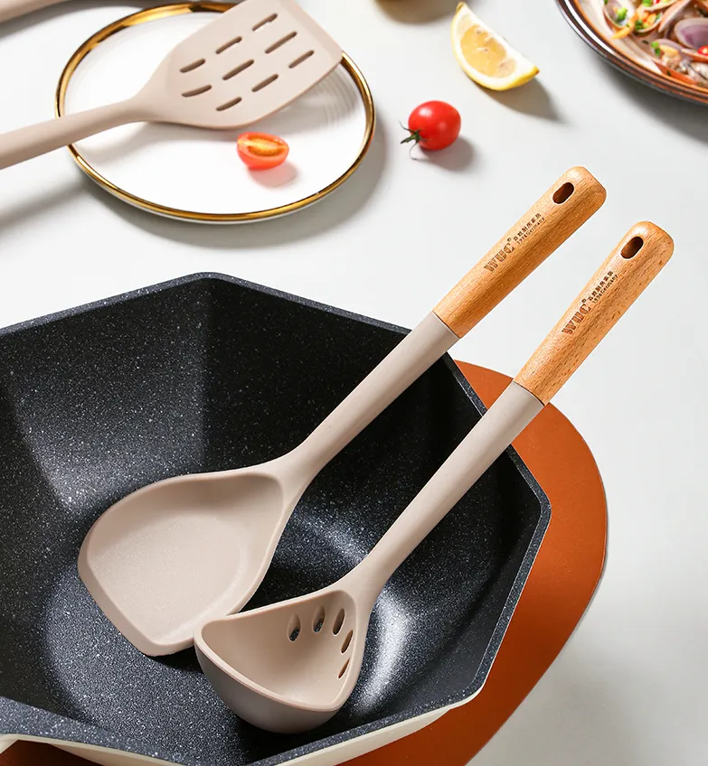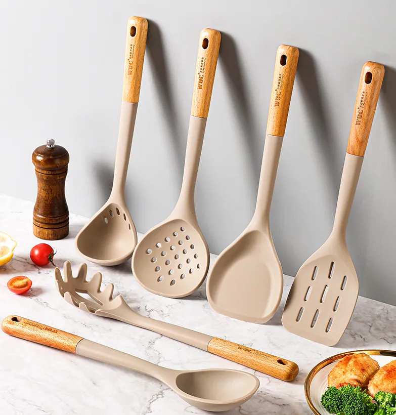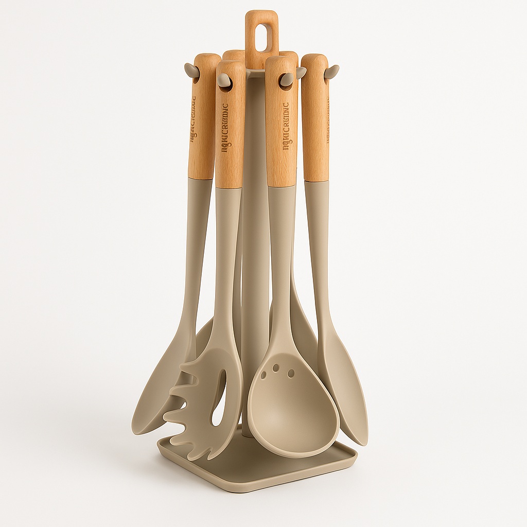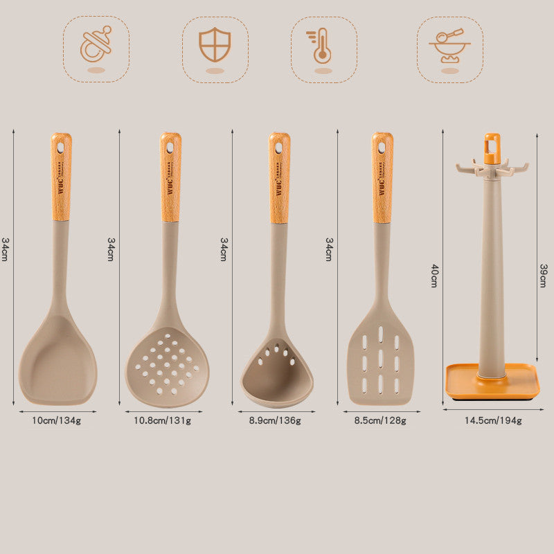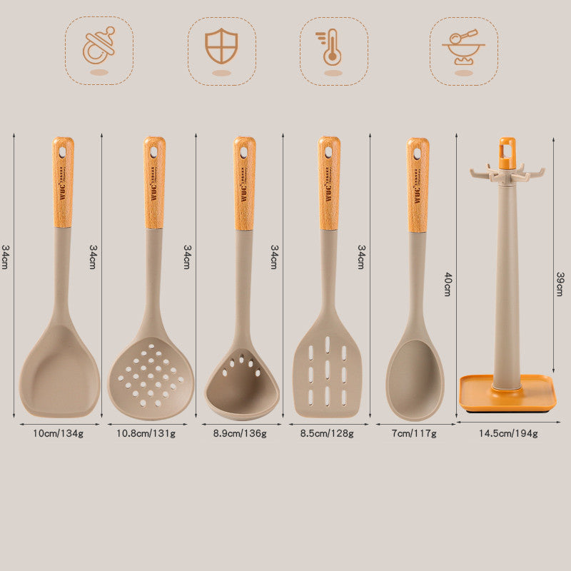 Uppgradera ditt kök med detta stilrena och funktionella silikon kökredskapset med trähandtag. Setet innehåller 7 praktiska redskap med värmetålig silikon (upp till 230°C) och hållbara trähandtag för ett naturligt och bekvämt grepp. Perfekt för både amatörkockar och proffs!