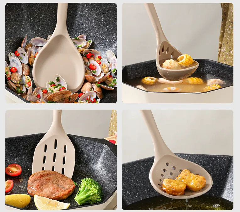 7 delar: Stekspade, soppslev, visp, slitsad stekspade, pensel, tång och ställ