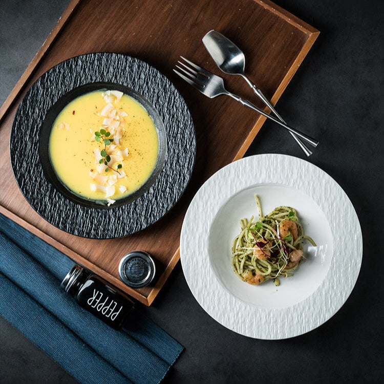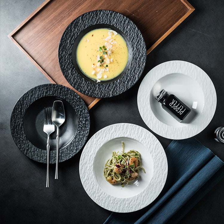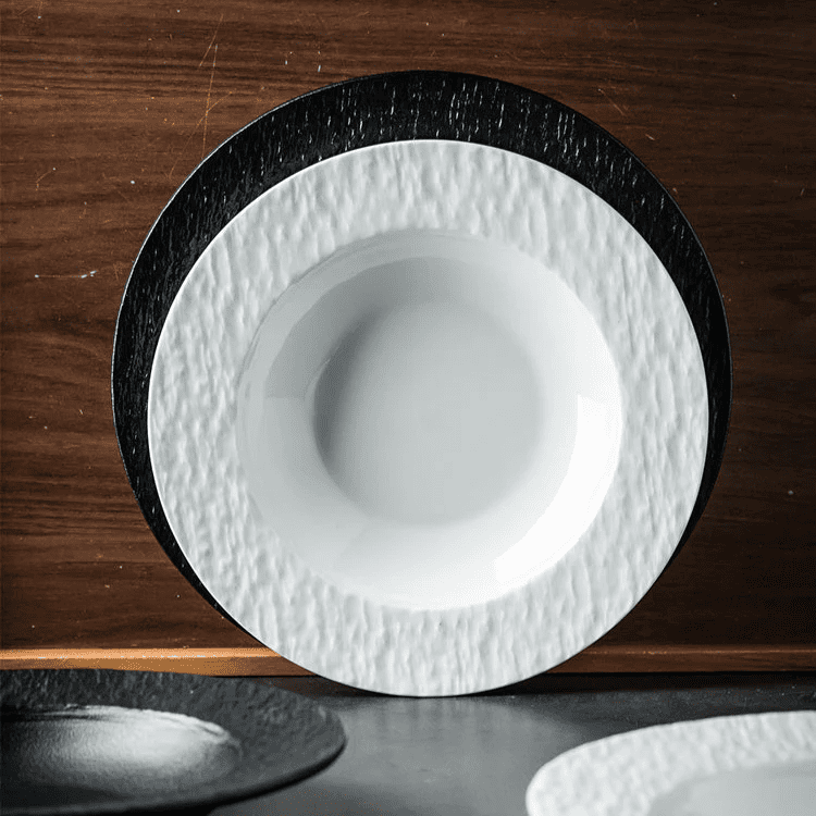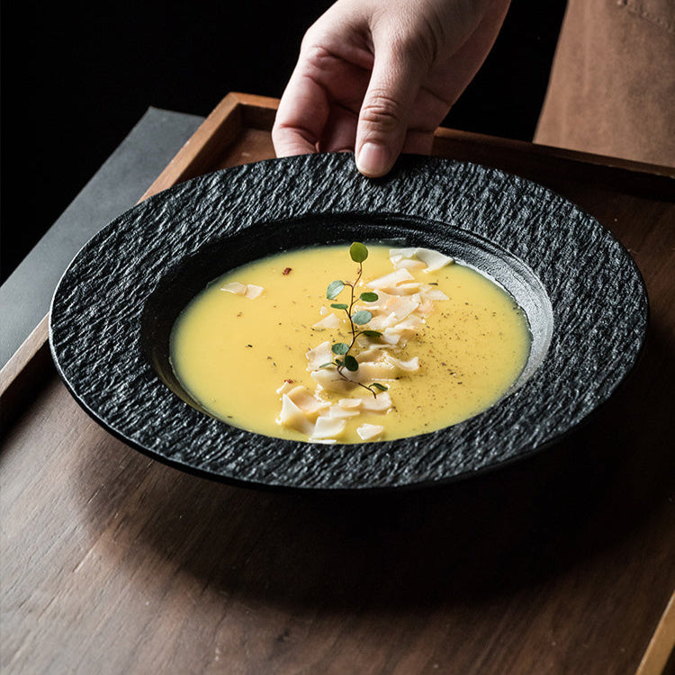 Elegant och funktionell keramisk sopptallrik med unikt stråhatt- och stenmönster – ett perfekt val för dig som vill kombinera estetik med praktisk vardagsanvändning.
